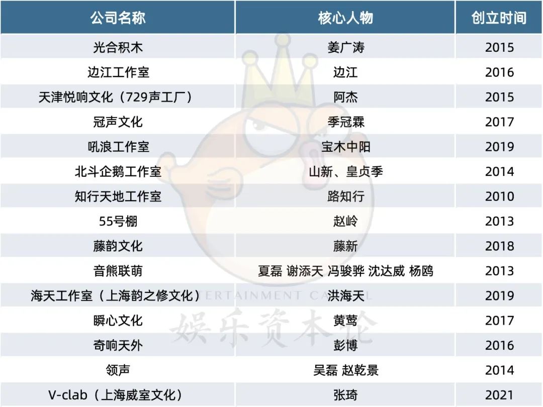 前者以光合积木、729声工场、北斗企鹅、冠声文化为代表,业务方面侧重影视作品;沪圈则以音熊联萌、海天工作室、领声、奇响天外等为代表,整体二次元特别是游戏项目较多。但业务范围只是相对而言,京圈CV也配过不少二次元项目。