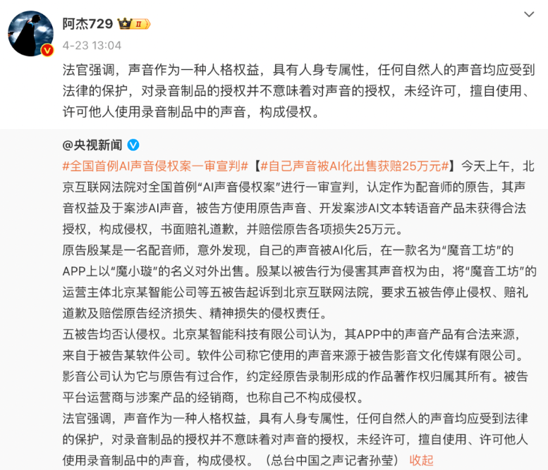 以夏磊、阿杰为代表的演员,对AI配音持怀疑态度,4月23日国内首例AI声音侵权案一审宣判后,两位更是转发微博旗帜鲜明表达自己立场:“任何自然人的声音均应受到法律的保护,对录音制品的授权并不意味着对声音的授权”。