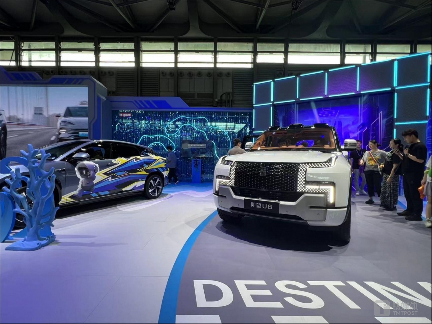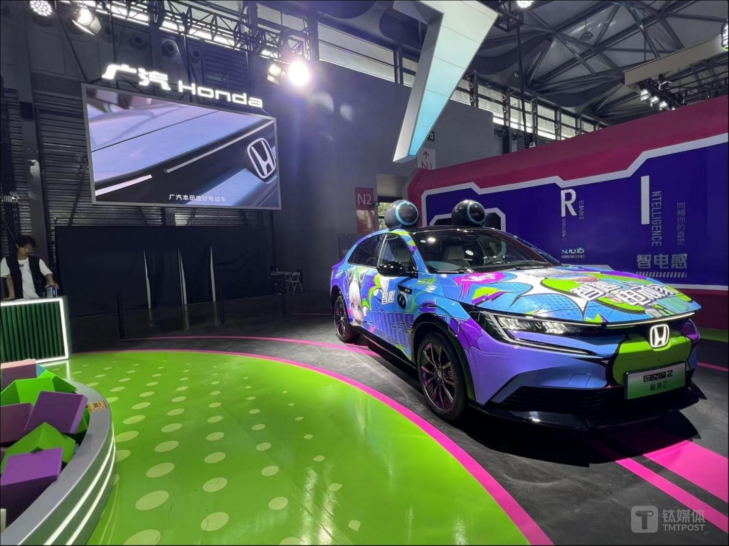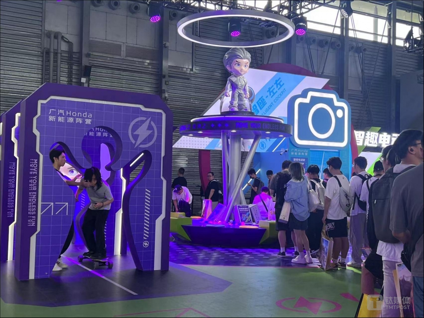 与比亚迪、小米的静态展示新款车型不同,钛媒体APP现场看到,“新人”广汽Honda更加注重玩家体验和互动,不仅将重点展示的新品纯电车型“e:NP2极湃2”爆改成吸睛的痛车(指将二次元作品人物的图案以彩绘或贴纸黏贴等方式装饰车辆车身外观),其展台还设置陆地冲浪、盲盒寻宝池、拍照等游戏,是唯一一家能引来了玩家排长龙打卡的车企展台。