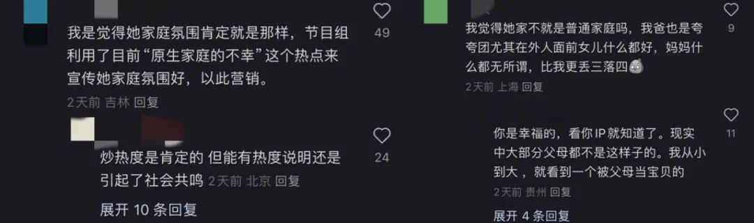 尤其对卢昱晓家庭的“过度吹捧”,让一部分网友觉得有些过于夸张。这些网友认为,卢昱晓这样的原生家庭很常见,没必要过度吹捧。但这却让另一部分网友觉得“很难过”,“你们眼中的普通是我一辈子的难以拥有”。