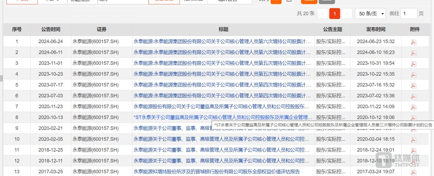 在2021年以及2022年两年里,永泰能源忙于债务重组,未有增持计划。到了2023年,公司分别于7月、10月进一步增持股票。今年6月,公司再次发布增持计划。