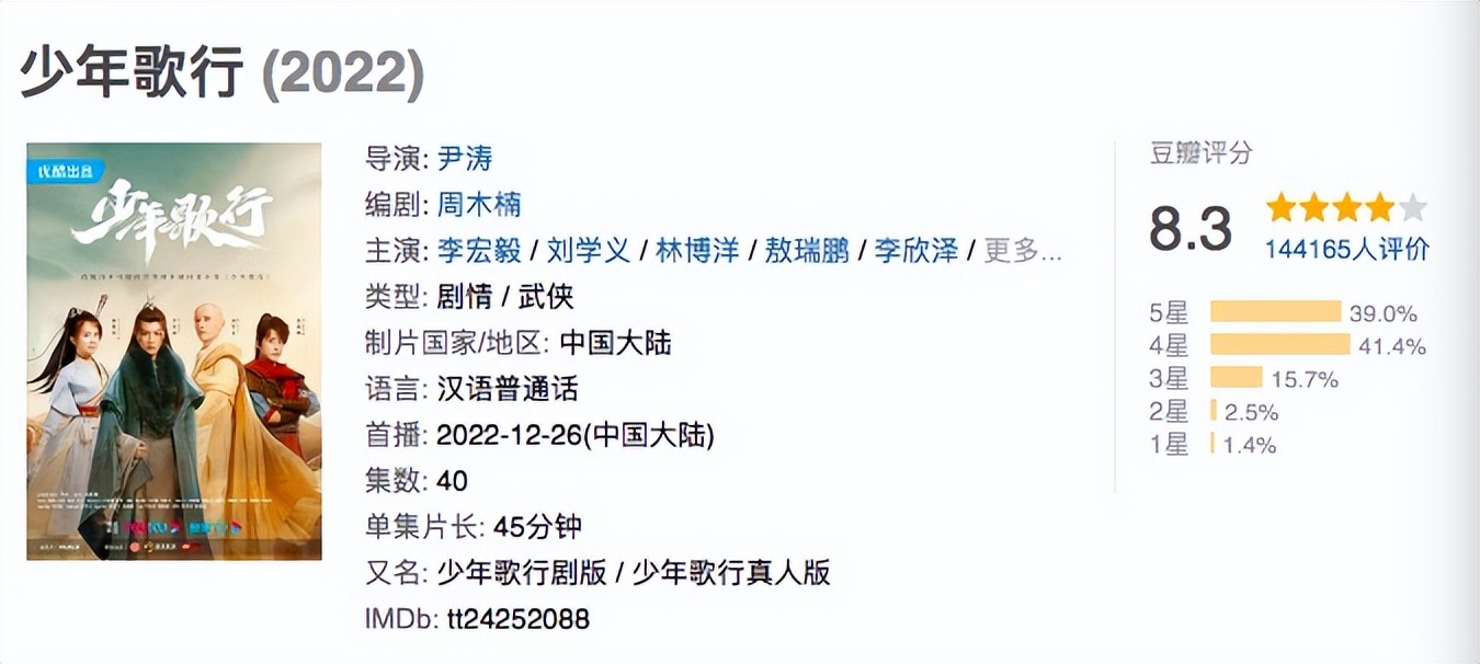 值得庆幸的是,这几年的市场逐渐趟过了“男频+顶流=烂剧”的泥潭。去年,成毅的《莲花楼》拿下了豆瓣8.5分的评价;再早前《长安十二时辰》同样让易烊千玺自此开启演员路上的高光时刻。作为二番男主,刘宇宁参演的《天行健》也拿下了豆瓣8.1分。