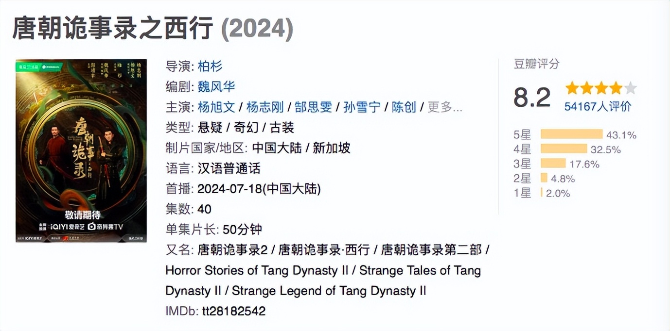 《少年歌行》和《唐朝诡事录》则是凭借口碑逆袭:前者豆瓣上引发14万人打分、评分8.3分,后者豆瓣评分人数达28.8万、评分7.9分。这也为这两部剧积累了大量的忠实观众,为第二部奠定了基础:数据显示,开播前两部剧的预约人数分别达到了650万和500万。