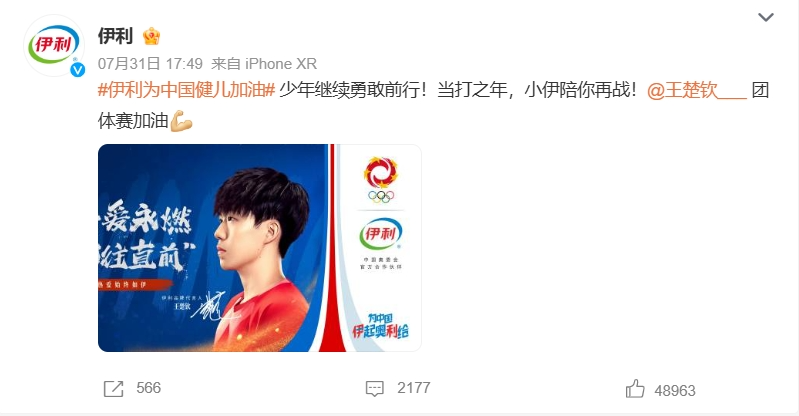 而在今年的巴黎奥运赛场上,刘翔作为代言人出现在了伊利的巴黎奥运宣传片中,品牌也在宣传文案中动情写道,“历经千帆,归来仍是少年。这么多年,你还是你。欢迎回来,我的老朋友刘翔。”王楚钦爆冷出局后,伊利也发布“少年继续勇敢前行!当打之年,小伊陪你再战!”微博。