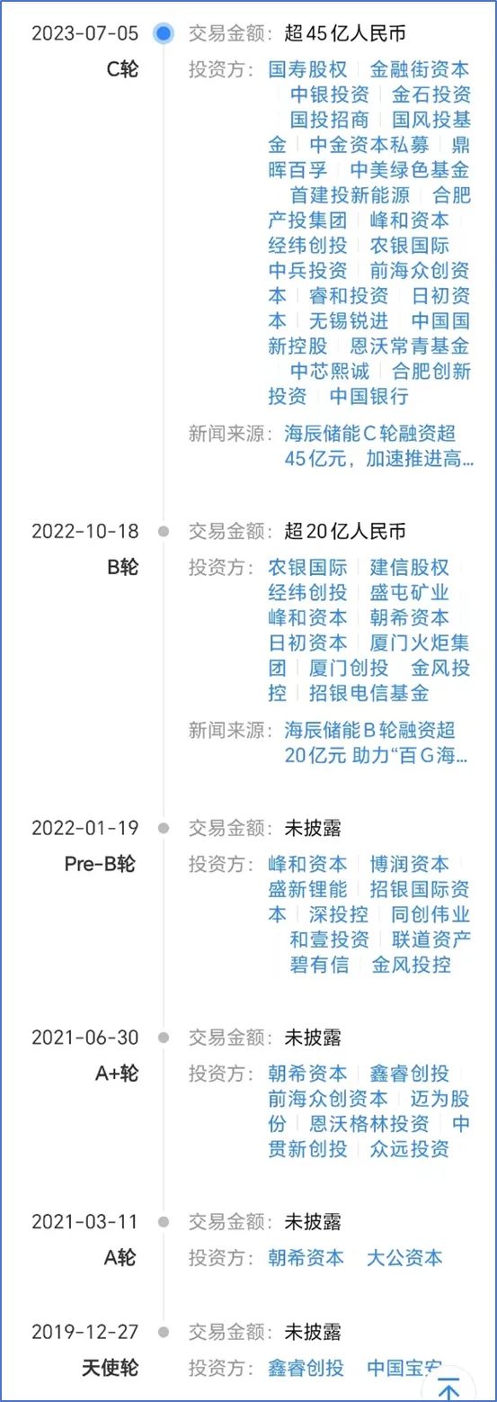海辰储能的每一轮融资也吸引了多家投资机构参与,有鼎晖这样的专业投资机构,也有广州产投、厦门创投这样的政府引导基金,还有迈为股份、盛新锂能等储能行业的上游企业。