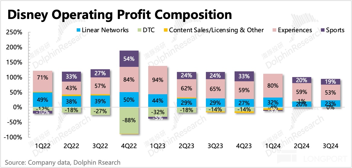 $迪士尼.US 美东时间 8 月 7 日美股盘前发布了 2024 财年第三季度(CY24Q2)业绩。整体上看好坏参半,好的方面遵循前几个季度的趋势,以及近期的一些变化,比如不断涨价的流媒体加速减亏、高票房大片迅速带动内容销售扭亏为盈等。但坏的是,主题公园提前降温了。这一点在 Comcast 财报(公园收入双位数下滑)发布后,市场也已经有所反应。而迪士尼管理层的展望也表明,本地需求放缓在下季度的影响会更加明显。