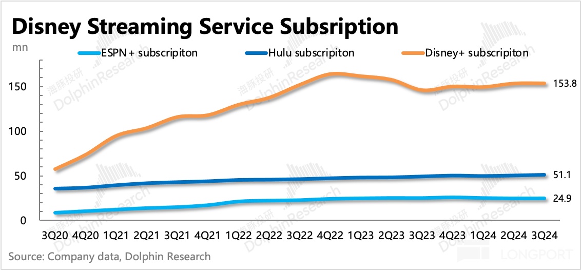 截至本季度末,Disney+ 订阅用户 1.538 亿,ESPN+2490 万,Hulu 5110 万,总计 2.298 亿的订阅用户数。短期来看公司对流媒体的经营重点,仍然在涨价来减亏上,公司对下季度的订阅用户增长指引也并不算高,表现为温和增长。