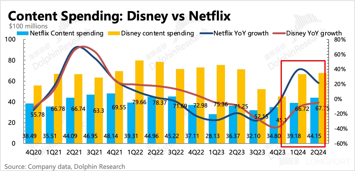 从近期几个季度的内容投资来看,虽然投资规模还在同比下滑,但下滑速度已经逐步放缓,有望在 2025 财年看到触底反弹。这种投资周期的趋势,在奈飞上也能同样看到。