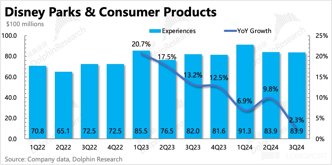 三季度主题公园以及消费品的收入 84 亿,同比增长 2.3%,相较于上季度快速放缓。内部结构中,公园业务增速 3.4%,消费品则又回到下滑。虽然对于后疫情红利的褪去有一定预期,但需求降温的速度还是肉眼可见的快。