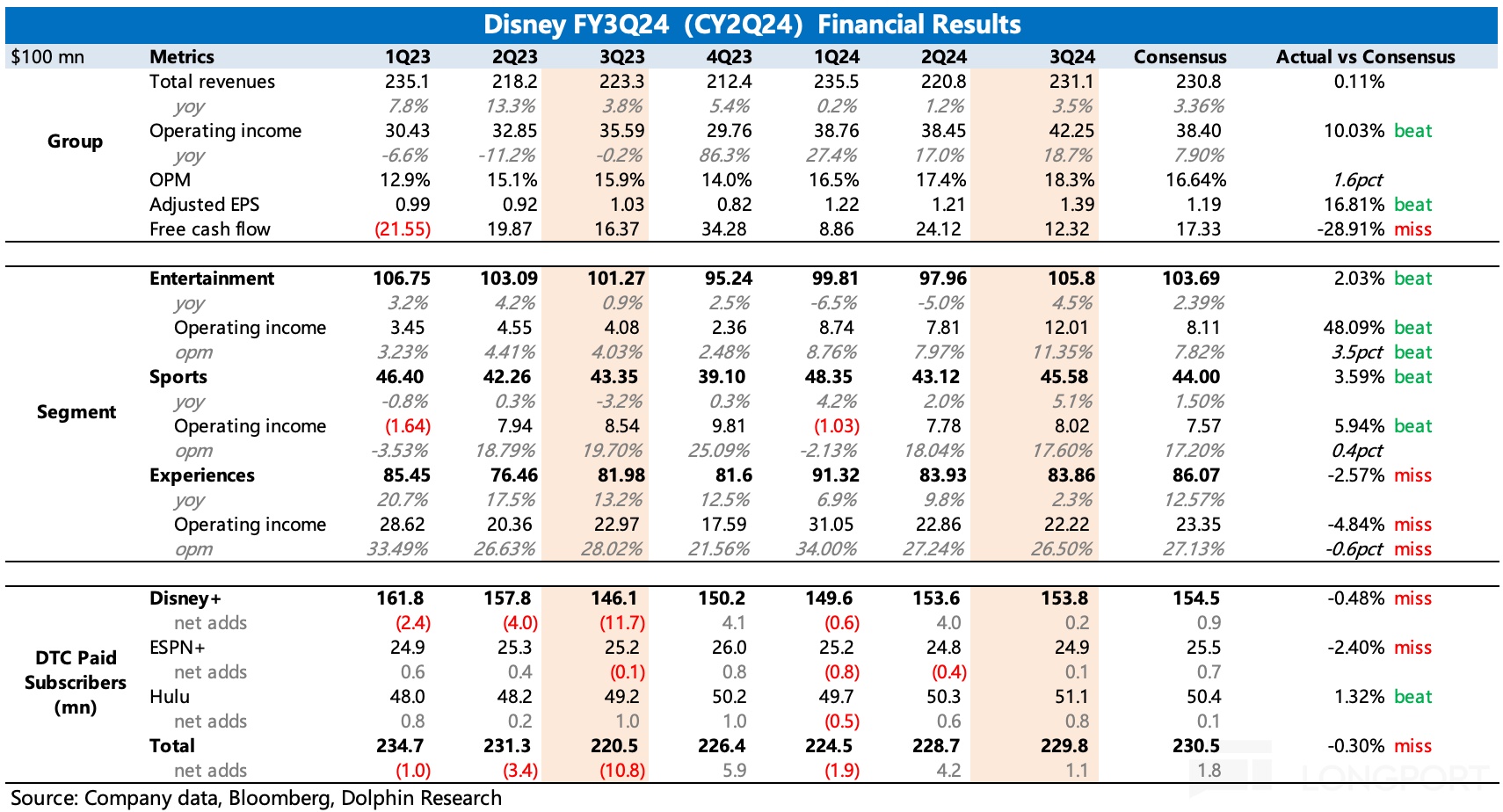 (1)娱乐业务整体表现超出预期,流媒体和影片销售收入表现略好,前者来源于 Disney+、Hulu 涨价以及订阅用户数小幅增长,后者来源于《头脑特工队 2》等大片的票房亮眼。