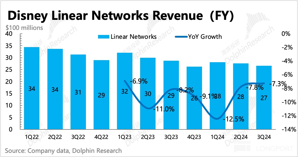 三季度有线电视收入仍然同比下滑 7.3%,难以抵挡用户剪线流失的大趋势。从收入细分来看,和上季度一样,还是订阅收入比广告收入下滑更多一些。海豚君认为,下半财年至 2025 财年 Q1,刚好对应大选关键期,政治广告收入在短期上有望延缓有线媒体的下滑速度。