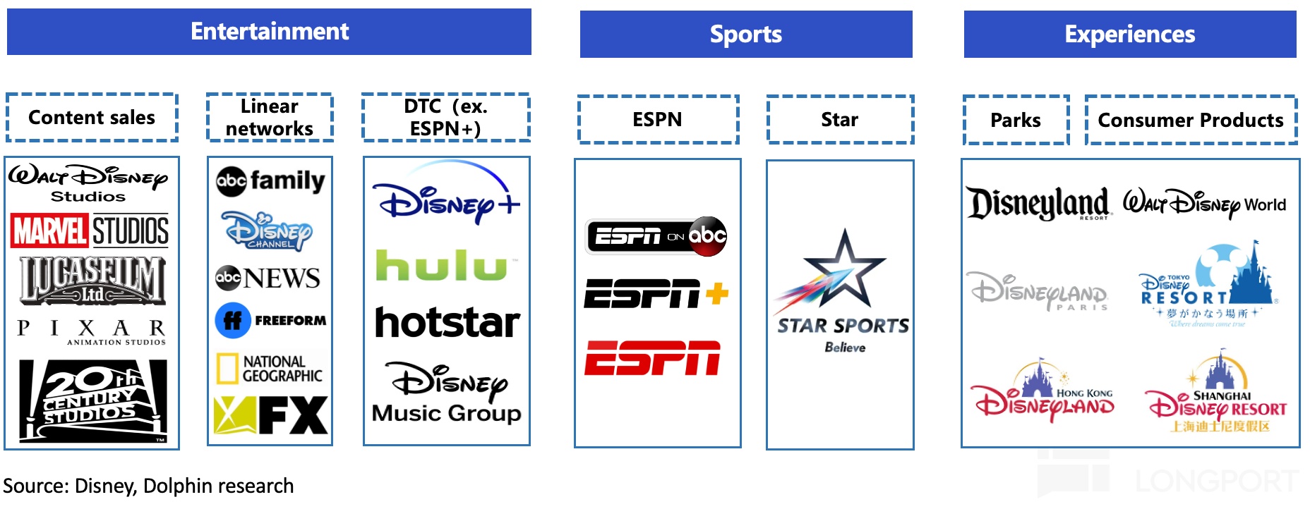 (1)【娱乐】业务包含:原有线渠道、DTC(除 ESPN+ 以外)、内容销售,同时处置了一些部门整合过程中重复的业务线以及收益偏低的传统渠道。