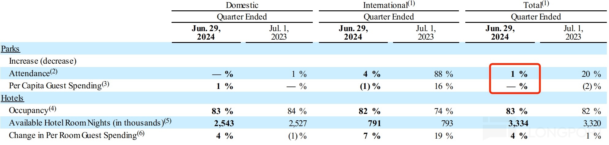 但最大的瑕疵出现在过去两年的业绩支柱——公园业务。虽然本地公园需求降温有迹可循,两周前 Comcast 的财报也已经很能说明需求放缓的问题,当时迪士尼的跟跌就已经说明市场预期的调整。而迪士尼管理层对下季度同比下滑个位数的指引,进一步印证了需求降温的实际情况。