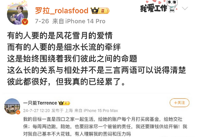 “巴拉拉能量”的风波,起源于罗拉发布的一条emo微博。她表示有的人要的是风花雪月的爱情,而有的人要的是细水长流的牵绊,直言“我真的已经累了”。言语间透露出自己渴望婚姻,而王能能只想停留在浪漫的恋爱阶段。有粉丝在评论区劝她何必在乎那一张纸,罗拉直白地回复道:“但生活不可能是我一直租房在这里等着他来恋爱,说的太轻松了”。