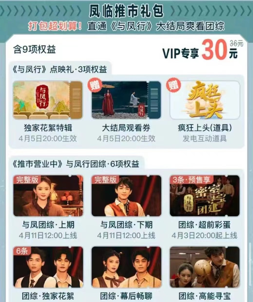 综艺市场的会员付费内容,以芒果布局为主、腾讯视频小有涉猎。后者为《与凤行》制作的团综《推市营业中·与凤行专场》,在上线后采用了付费模式,不过从玩法上看更倾向于剧集端的“大礼包”模式,将综艺内容、剧集大结局观看券、幕后内容等进行绑定。与综艺端的单集付费还略微有所不同,但不失为一种探索。