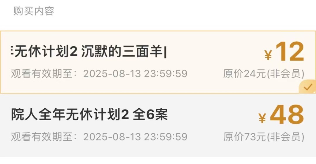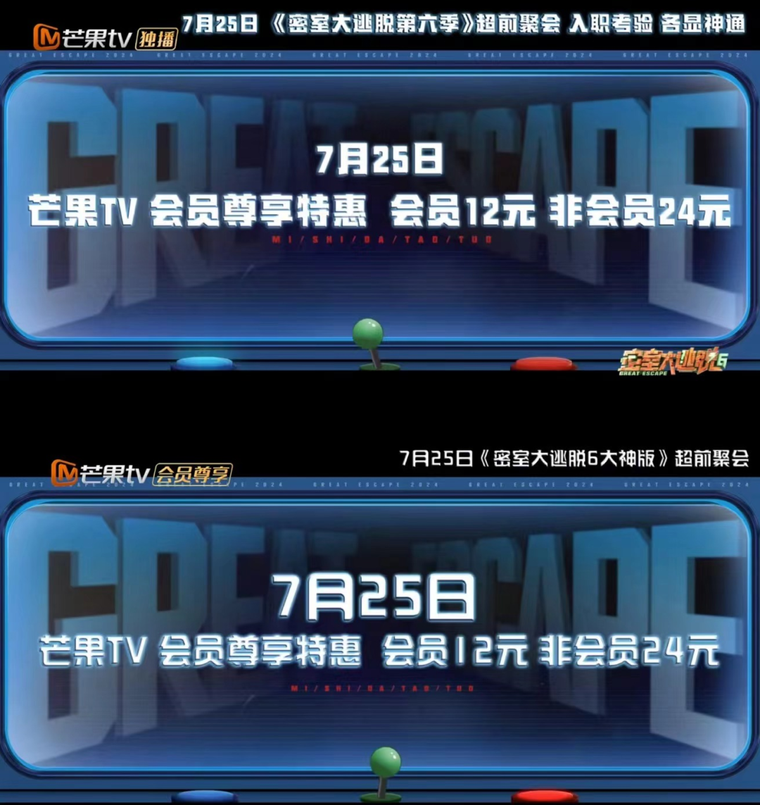 前两年,芒果已经对院人和0713参与的综艺进行过付费观看的尝试。《密室大逃脱4》的0713体验版、《院人全年无休计划1》等皆推出了会员8元购买单集、12元购买1-2期(非会员翻倍),SVIP可免费观看的玩法。