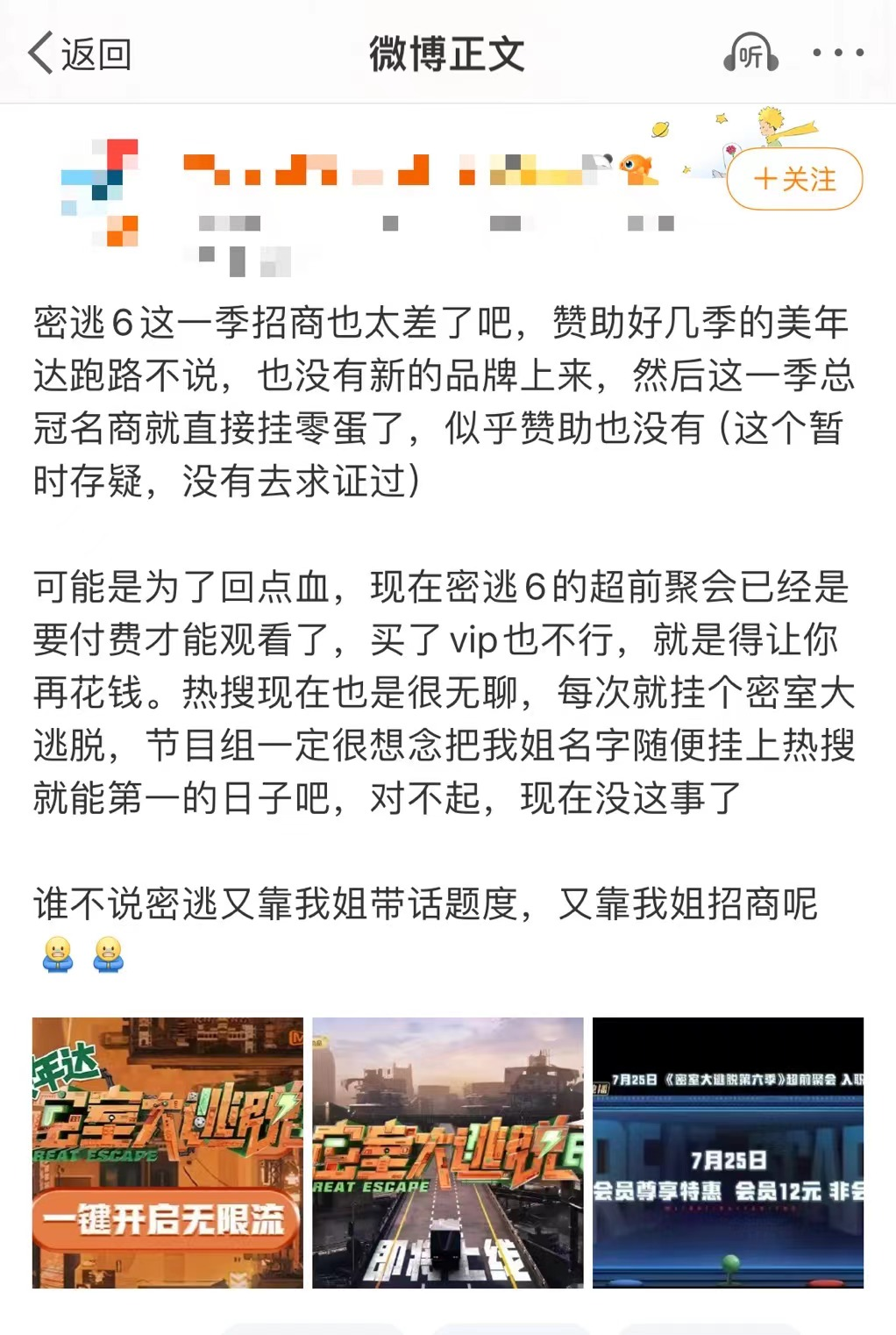 平台吃相难看的质疑,持续被割韭菜的难过,还夹杂着养成系的纠葛,确实一言难以道尽。不过小萌也在网上冲浪的过程中接受了一些说法:这一季《密逃》并没有品牌赞助,连老伙伴美年达都“跑路”了;大神版虽有南波万的独家冠名,但也是自营品牌。换言之,节目要继续就必须有人买单。
