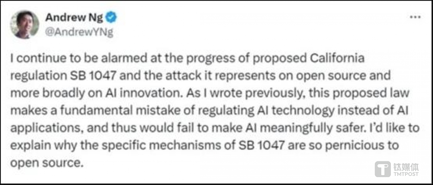 他仍然认为美国加州拟定的SB 1047法案对开源大模型带来的巨大伤害感到震惊。这个法案犯了一个严重根本性错误,应该监管的是通过大模型开发的生成式AI产品,而不是开源大模型本身。