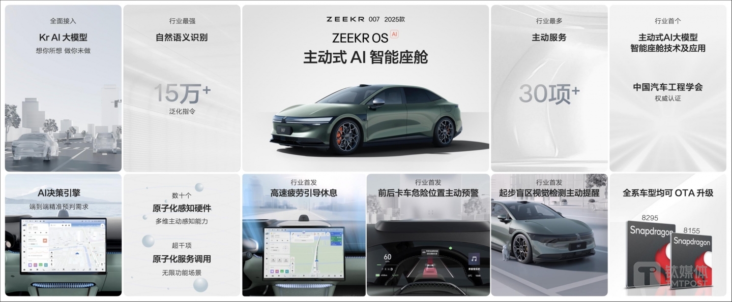 据悉,2025款车型将智能座舱系统升级为“AI OS”,引入了Kr大模型,让车载智能助手“Eva”蜕变成“AI Eva”。而极氪自研的Kr AI大模型,也获得了中国汽车工程学会的“基于大模型的智能座舱主动式服务关键技术及应用”的权威认证。