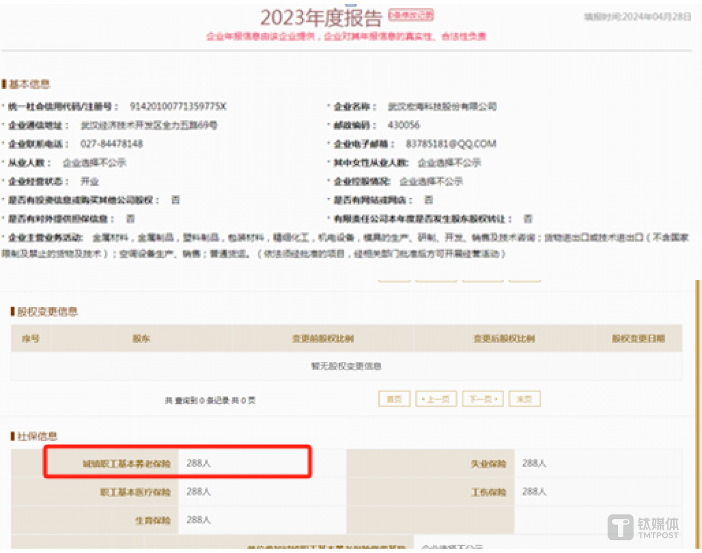 令人不解的是,国家企业信用信息公示系统显示,2023年宏海科技共有288人缴纳了社保。这就不禁令人疑惑,2023年下半年,宏海科技是有大量员工离职?还是宏海科技存在未给员工缴纳社保的情形?