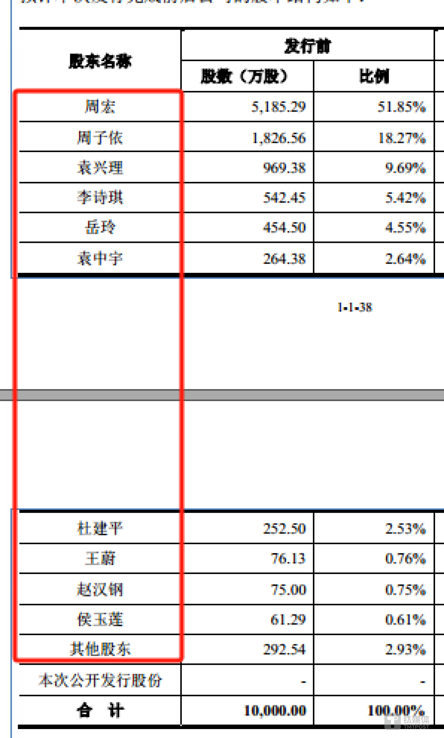 除了员工情况外,宏海科技的股东情况也令人费解。招股说明书显示,在此次IPO股票发行前,周宏、周子依、袁兴理、李诗琪、岳玲等均是公司股东,总股本为1亿股,具体情况如下: