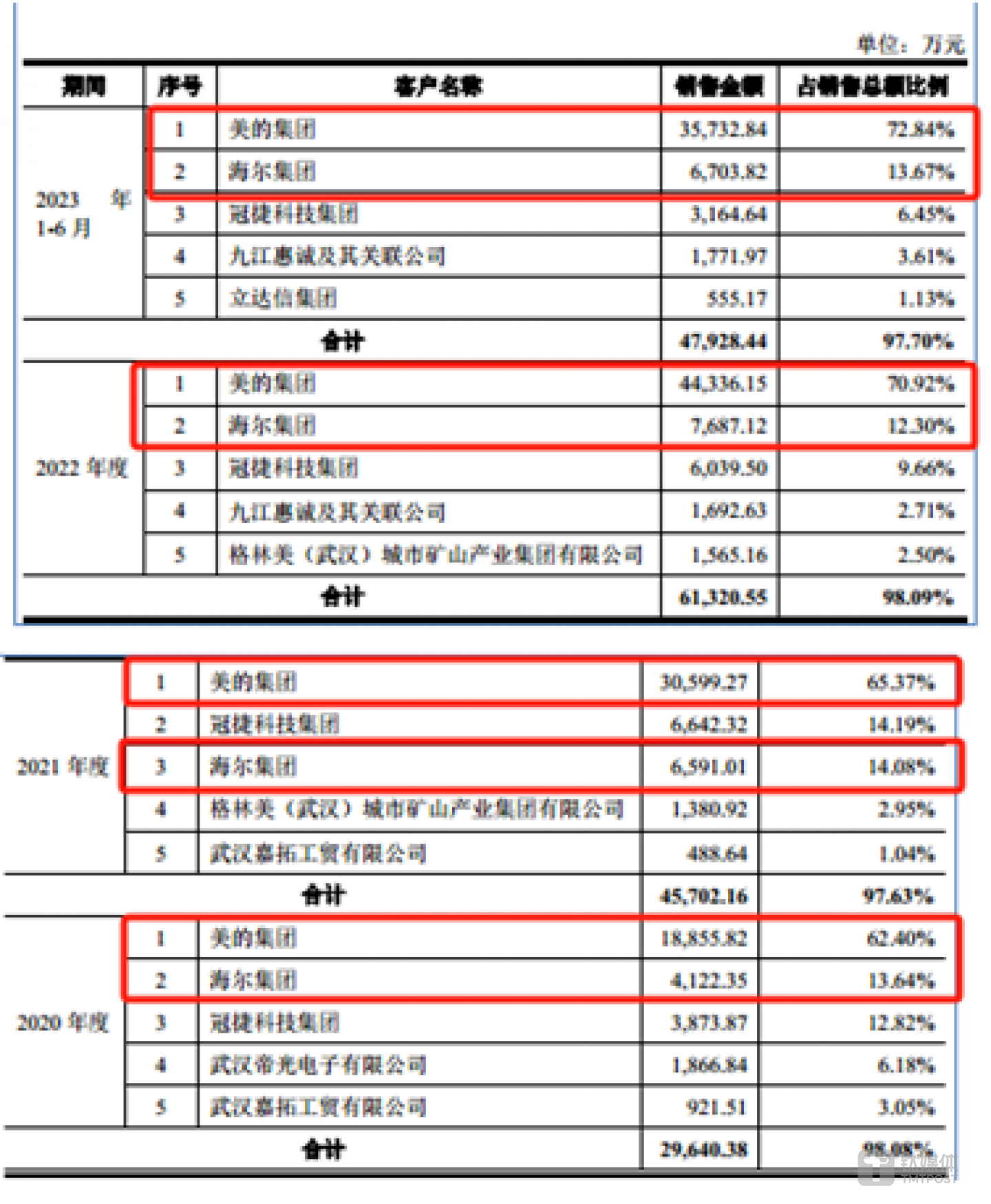 其中向美的集团产生的销售收入分别为18855.82万元、30599.27万元、44336.27万元,分别占当期营业收入的62.4%、65.37%、70.92%、72.84%;向海尔集团产生的销售收入分别为4122.35万元、6591.01万元、7687.12万元、6703.82万元,分别占当期营业收入的13.64%、14.08%、12.3%、13.67%。也就是说,美的集团和海尔集团两家公司每年至少给宏海科技贡献超过7成的收入。