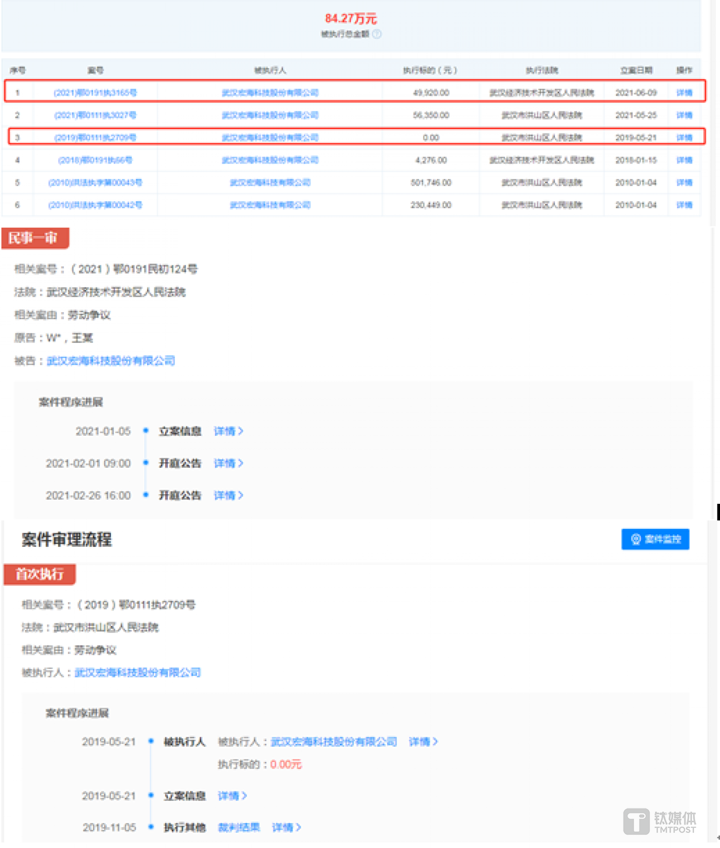 特别是2021年和2019年,宏海科技先后两次因劳务争议成为了被执行人。