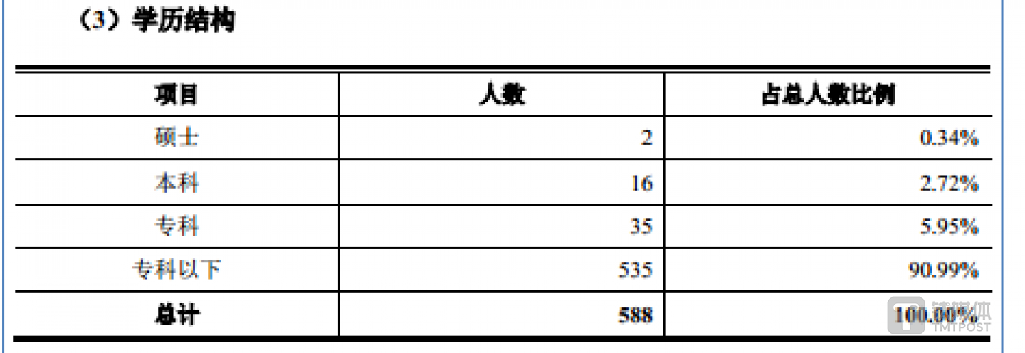从员工组成机构上来看,截至2023年6月末,宏海科技拥有588名员工,其中学历在本科及以上共18人,专科及以下的570人,这也意味着,96.94%的员工学历在专科及以下。