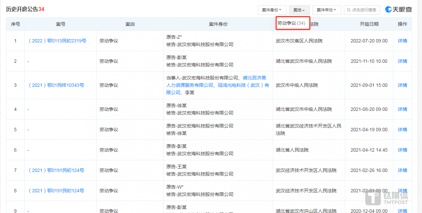 另外,钛媒体APP注意到,宏海科技还与员工存在不少的劳务纠纷。天眼查显示,宏海科技曾34次因与员工的劳务争议而对簿公堂。