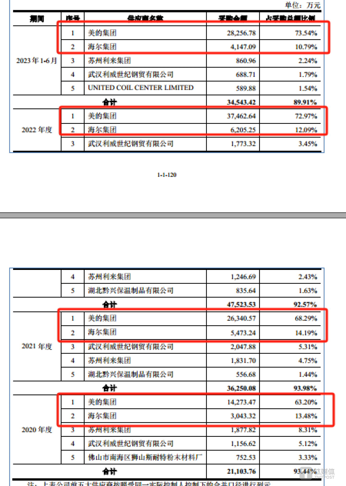 需要指出的是,美的集团、海尔集团除了长期霸占着宏海科技的前两大客户头衔之外,其还同时霸占着宏海科技的前两大供应商。报告期内,宏海科技向美的集团采购的金额分别为14273.47万元、26340.57万元、37462.64万元、28256.78万元,分别占当期采购总额的63.2%、68.29%、72.97%、73.54%;向海尔集团采购的金额分别为3034.32万元、5473.25万元、6205.25万元、4147.09万元,分别占当期采购总额的13.48%、14.19%、12.09%、10.79%。也就是说,宏海科技每年向美的集团和海尔集团至少采购7成的原材料。