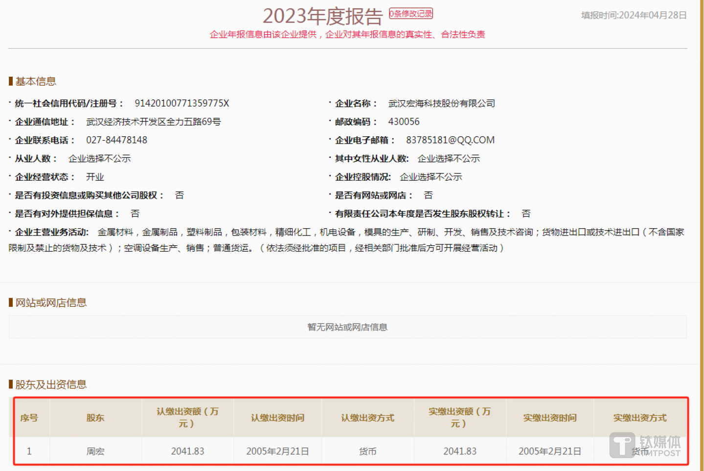 然而,国家企业信用信息公示系统显示,2023年,宏海科技仅有周宏一名股东,并且通过认缴和实缴出资额均为2041.83万元。