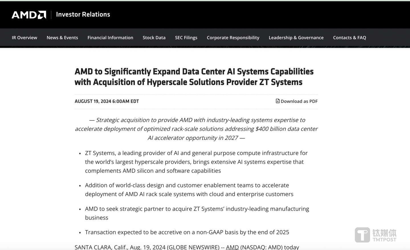 AMD表示,49亿美元中,包括根据交易完成后的某些里程碑支付的高达 4 亿美元的或有付款。该公司强调,ZT Systems在设计和优化云计算解决方案方面拥有丰富经验,此次收购还将帮助云和企业客户显著加快大规模部署由AMD提供支持的AI基础设施,促使AMD提供基于跨芯片、软件和系统创新的领先AI训练和推理解决方案。AMD 预计,到2025年底,该交易将在非GAAP收入基础上实现增值。
