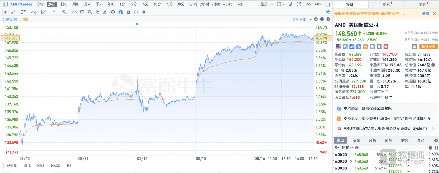 消息公布后,AMD美股大涨,盘前现涨超2%,此前跌近1%。