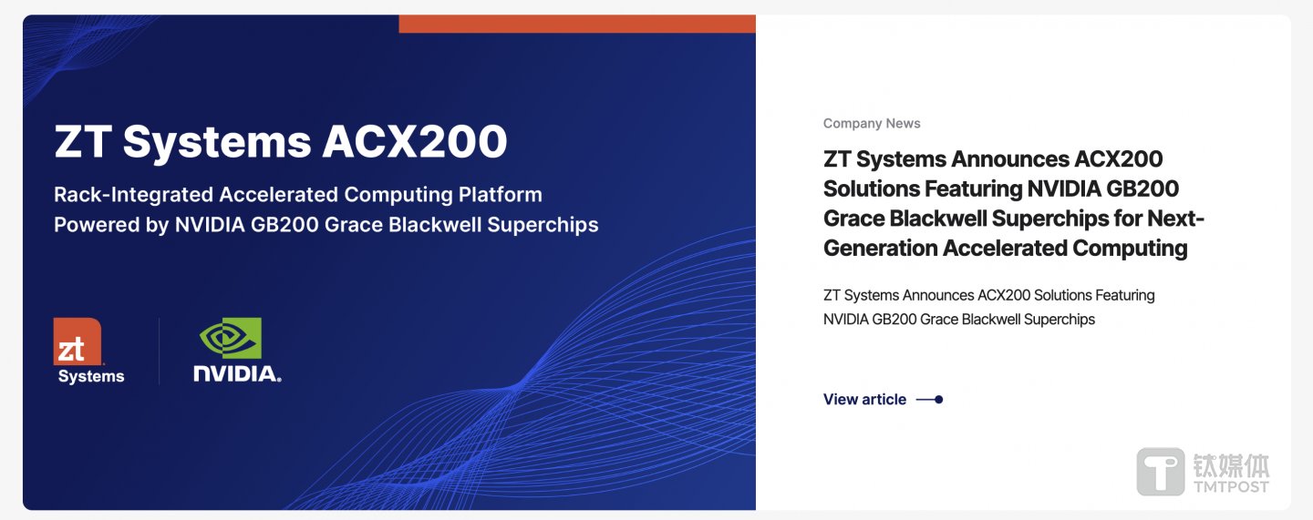 值得注意的是,英伟达、OpenAI一直是ZT Systems的客户。今年6月,ZT Systems宣布推出采用 NVIDIA GB200 Grace Blackwell 超级芯片的 ACX200 解决方案,用于下一代加速计算。