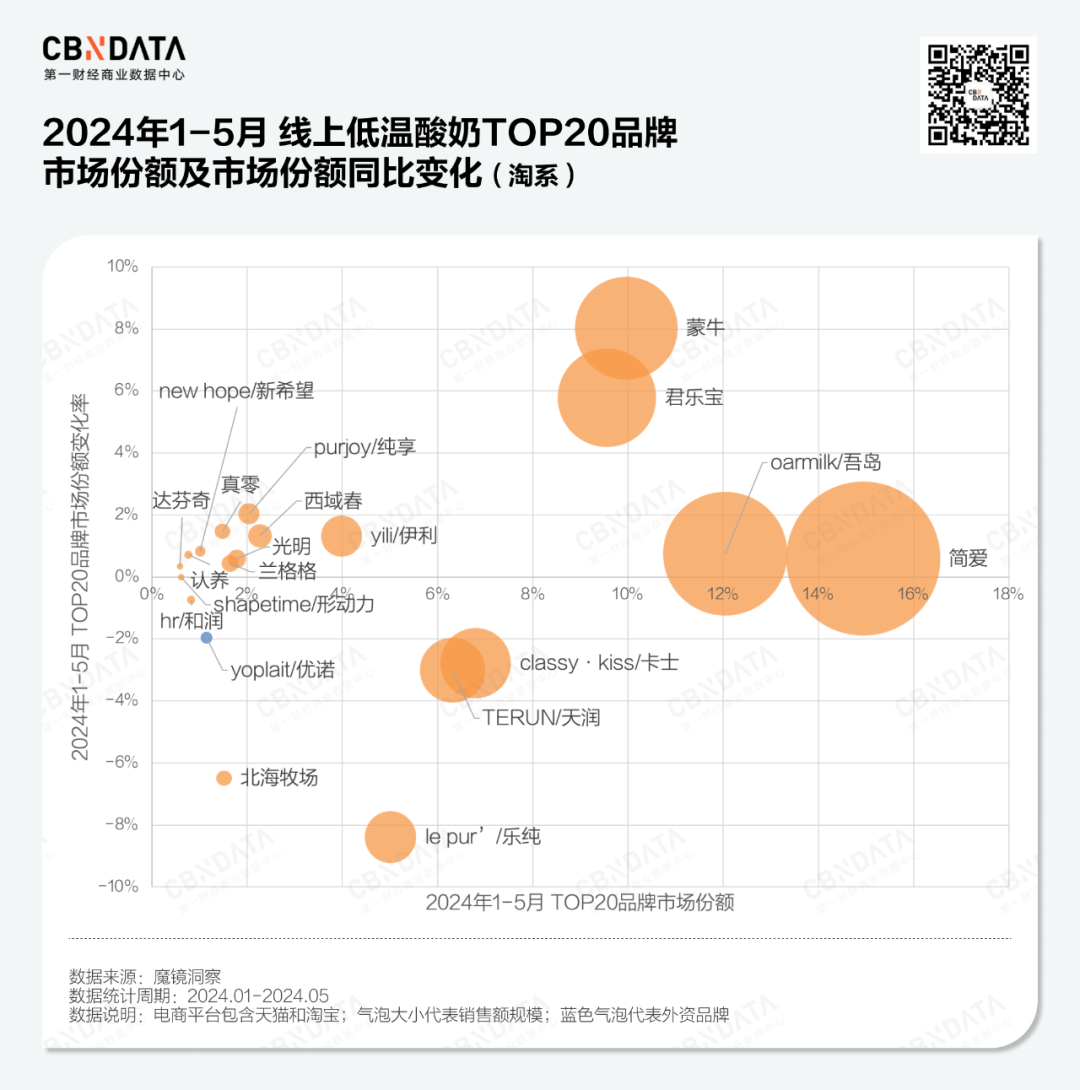 线上渠道中,这些新品牌也不甘示弱,如简爱、吾岛、乐纯等品牌也出现在了2024年1-5月线上低温酸奶TOP20(淘系)的名单当中。