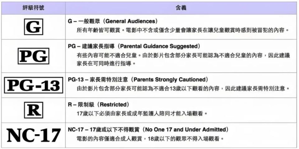 1966年,美国电影协会与全美影院业主协会、美国国际电影进口商和分销商协会一起商榷确立电影分级体系,在不断地摸索与完善中,美国正式确立电影分级制度,五级分级体系一直施行至今——G级(所有年龄段可观看)、PG级(建议儿童在父母陪伴下观看)、PG-13级(13岁以下儿童需父母陪伴观看)、R级(未满17岁需家长陪同观看)、NC-17级(17岁以下观众禁止观看)。