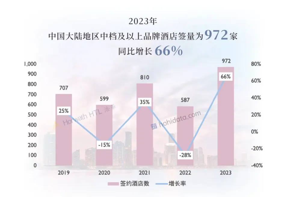 浩华数据显示,2023年全年,中国大陆地区中档及以上品牌酒店签约量显著回升,共签约972家,同比增长66%,创下近五年来的历史新高纪录。