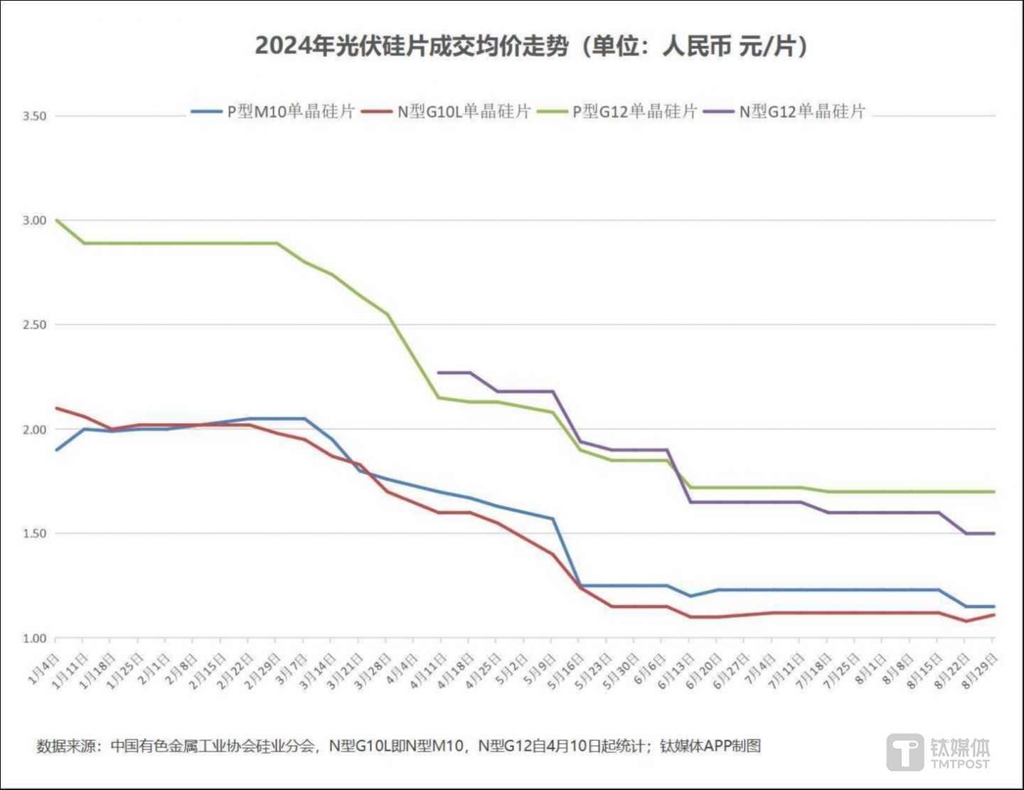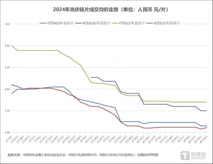 根据硅业分会的统计,P型M10单晶硅片目前成交价格区间为1.1-1.25元/片,最低价较上月又有所降低,成交均价目前为1.15元/片,较7月底下跌6.5%,三季度跌幅亦为6.5%,较年初水平则低了39.5%;P型G12单晶硅片目前成交价格区间为1.65-1.7元/片,成交均价为1.7元/片,与7月底持平,三季度至今下跌1.2%,全年至今下跌43.3%;N型G10L单晶硅片成交价格区间为1.1-1.15元/片,成交均价为1.11元/片,较7月底微跌0.89%,不过,值得提及的是,上个月该产品价格曾小幅上涨,本月降价后价格仍高于6月水平,但全年至今也下跌了39.5%;N型G12单晶硅片成交价格锚定在1.5元/片,较7月底下跌6.3%,三季度至今下跌9.1%。