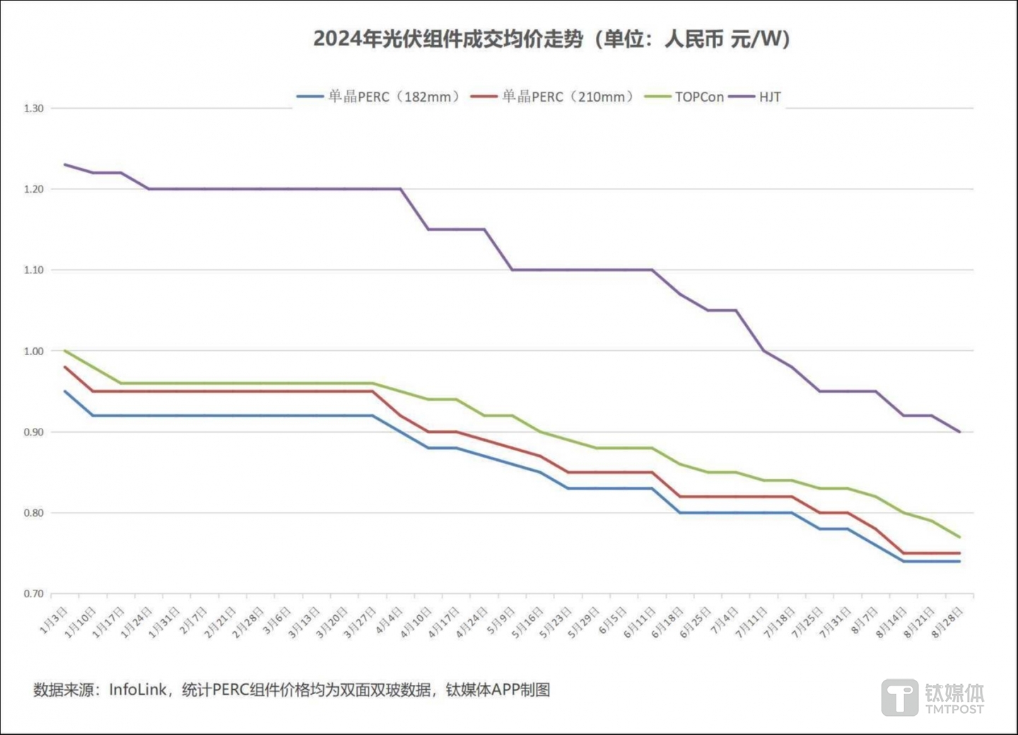 根据InfoLink方面公布的数据,截至8月底,单晶PERC组件(182mm,双面双玻)成交价格区间为0.67-0.8元/W,成交均价已降至0.74元/W,较7月底又跌去5.1%,三季度下跌7.5%,全年至今跌幅扩大到22.1%;单晶PERC(210mm,双面双玻)成交价格区间降至0.72-0.8元/W之间,成交均价为0.75/W,较7月底下降6.3%,三季度下降8.5%,全年至今下跌23.5%;N型组件方面,TOPCon目前成交价格区间为0.71-0.82元/W,成交均价本月降至0.8元/W线以下,为0.77元/W,较7月底大跌7.2%,三季度跌幅达到9.4%,全年至今下跌23%;HJT目前成交价格在0.83-0.95元/W之间,最高价本月降至1元/W以下,成交均价降至0.9元/W,较7月底下跌5.3%,三季度下跌14.3%,全年至今降幅进一步扩大至26.8%。