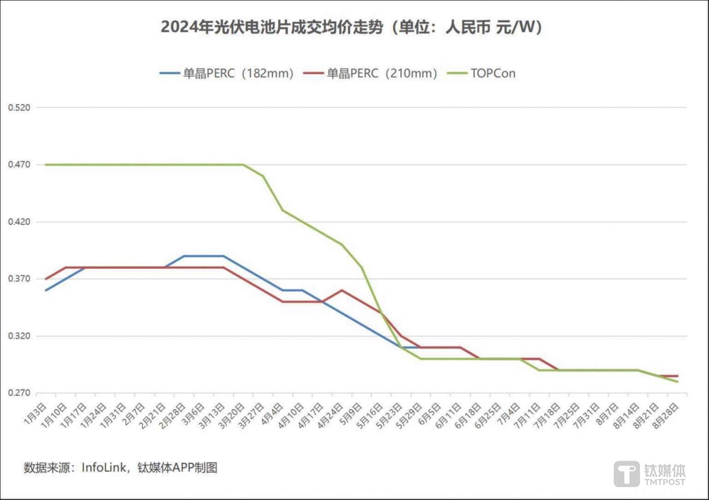 根据InfoLink方面的统计数据,截至8月底,单晶PERC(182 mm)成交价格区间在0.28-0.3元/W之间,成交均价为0.285元/W,较7月底又跌了1.7%,三季度跌幅为5%,全年至今下跌20.8%;P型的另一品类单晶PERC(210 mm)成交价格区间在0.28-0.29元/W之间,成交均价同样为0.285元/W,较7月底同样下跌1.7%,全年至今下跌23.0%。N型电池方面,主流TOPCon产品随着产能继续释放,竞争也愈发激烈,不仅降价幅度大于P型,成交均价也已低于P型,截至8月底该产品成交价格区间在0.27-0.29元/W之间,成交均价为0.28元/W,较7月底下降3.5%,三季度下跌6.7%,今年已下跌40.4%。