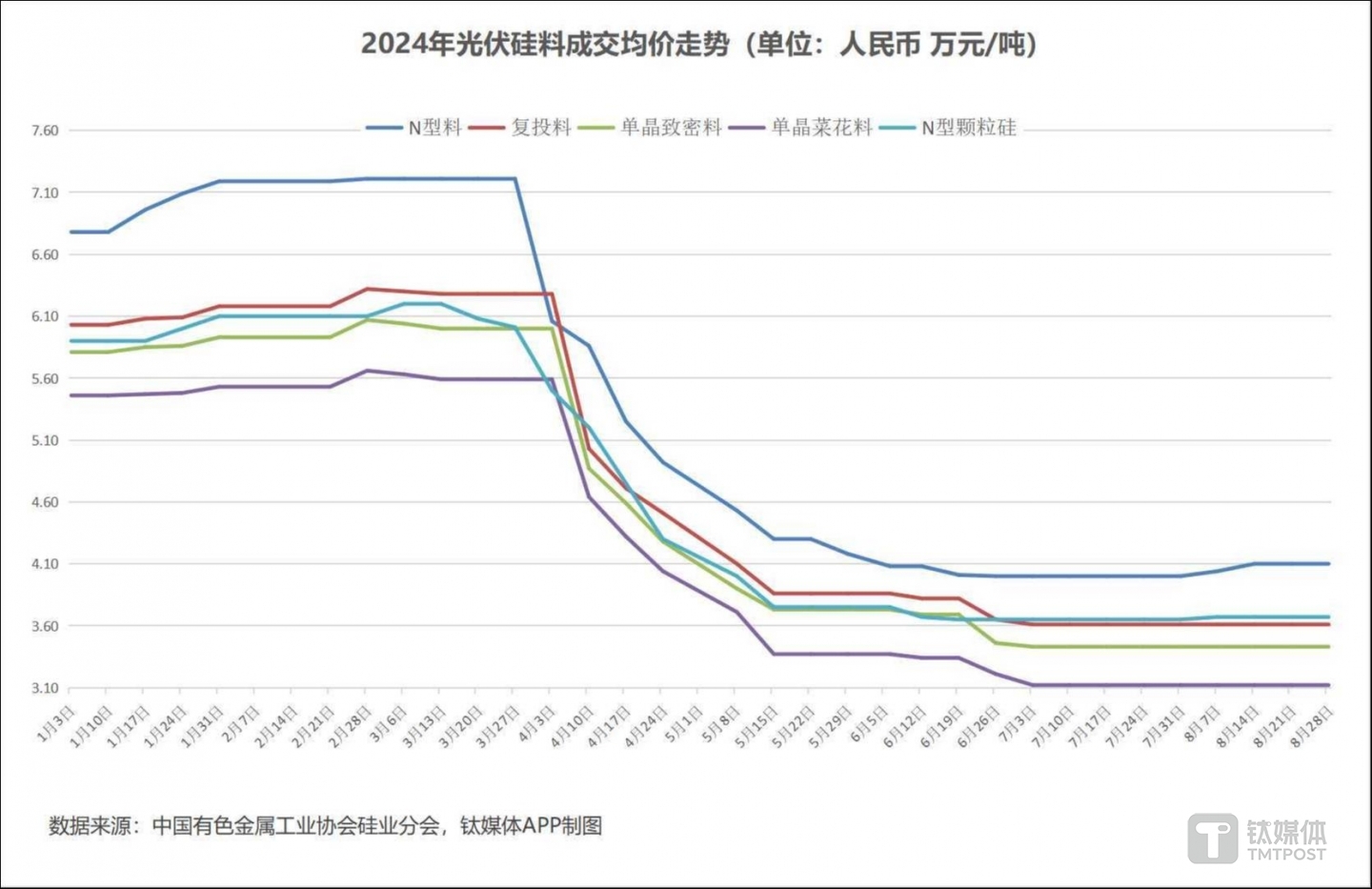 从数据来看,根据中国有色金属协会硅业分会的统计,截至8月底,N型棒状硅成交价格区间为3.9-4.4万元/吨,最低价和最高价均有所提升,成交均价为4.1万元/吨,较7月底提升2.5%,三季度至今同样上涨2.5%,较年初水平则下跌39.5%;N型颗粒硅方面,成交价集中在3.6-3.7万元/吨,均价为3.67万元/吨,较7月底微涨0.55%,全年至今下跌37.8%;此外,复投料成交价格区间为3.5-3.8万元/吨,成交均价为3.61万元/吨,与7月持平,三季度总体上亦无变化,较年初水平则下跌40.1%;P型致密料成交价格区间在3.3-3.6万元/吨之间,成交均价为3.43万元/吨,与7月相比无涨无跌,今年至今下跌41%;P型菜花料目前成交价格区间在3-3.3万元/吨之间,成交均价为3.12万元/吨,与7月持平,今年至今下跌42.9%。