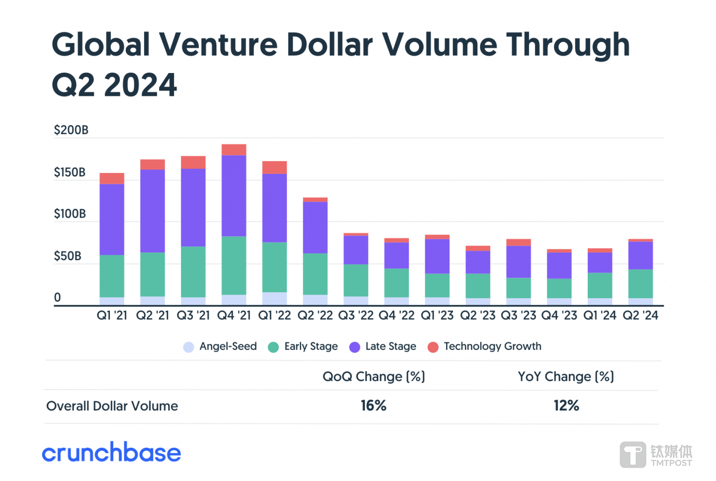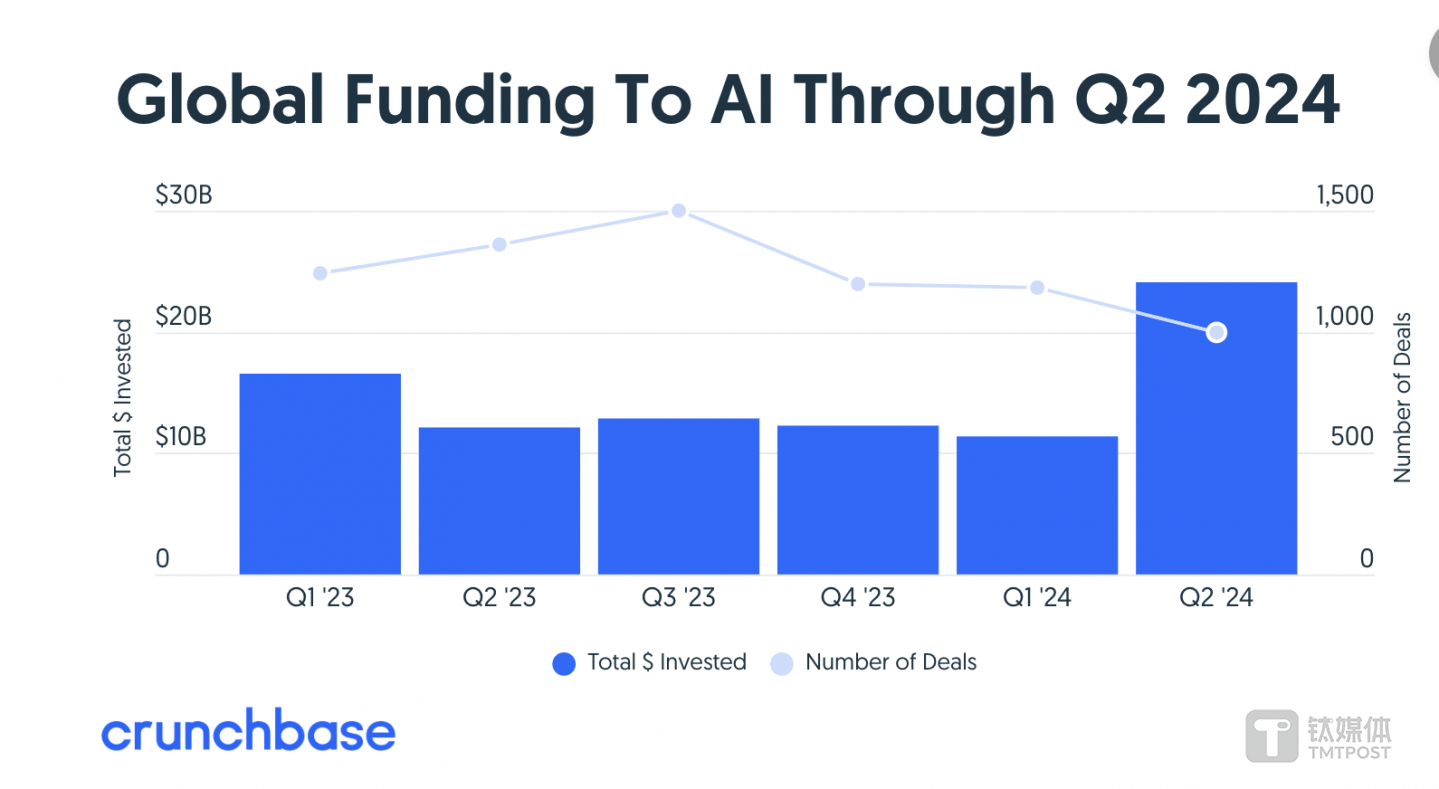 根据CrunchBase的数据,今年上半年,全球融资总额同比下降5%。但其中,AI领域初创公司的投融资规模同比增长24%,第二季度甚至达240亿美元创最高季度记录,但总值依然不过是2021年的70%。