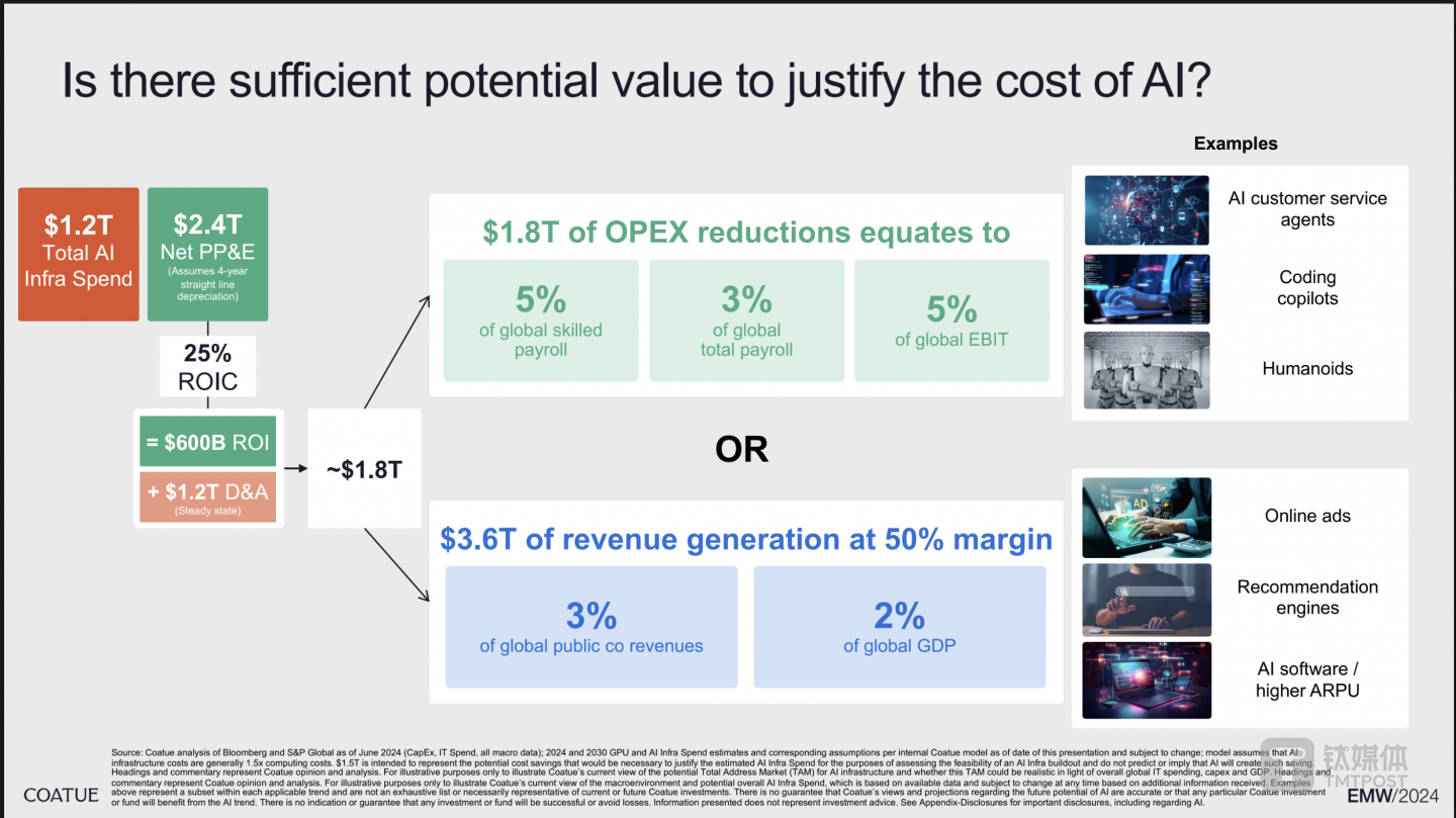因此,Coatue认为,到2030年,AI的投入必须转化出1.8万亿美元的净收入,或是收入3.6万亿美元下利润率达50%,才能实现收支平衡——这几乎不太可能。