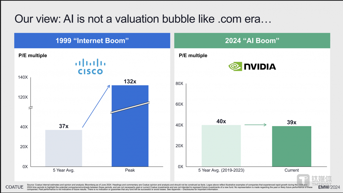 Coatue也认为,相比1995年思科股价的爆发,当前英伟达3万亿美金市值所映射的 AI 泡沫,并没有想象当中那么大,而且微软、谷歌、亚马逊也都存在更大的 AI 软件收入预期。