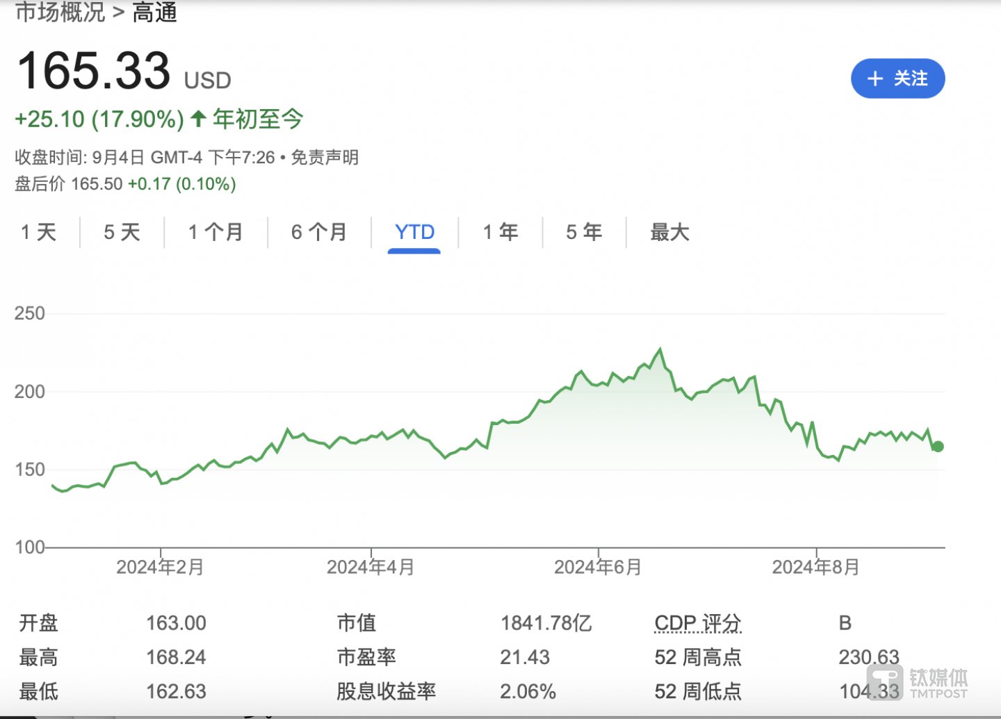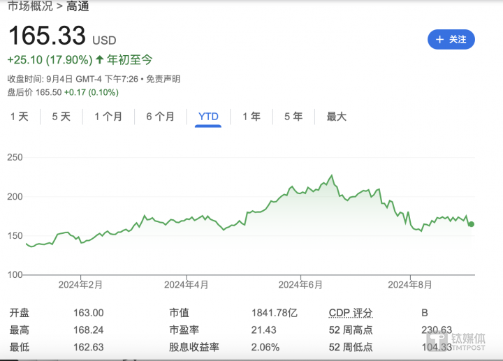 受到消息影响,截至美股周三收盘,高通公司股价上涨1.28%,报165.33美元/股,年初至今高通已上涨17.90%。