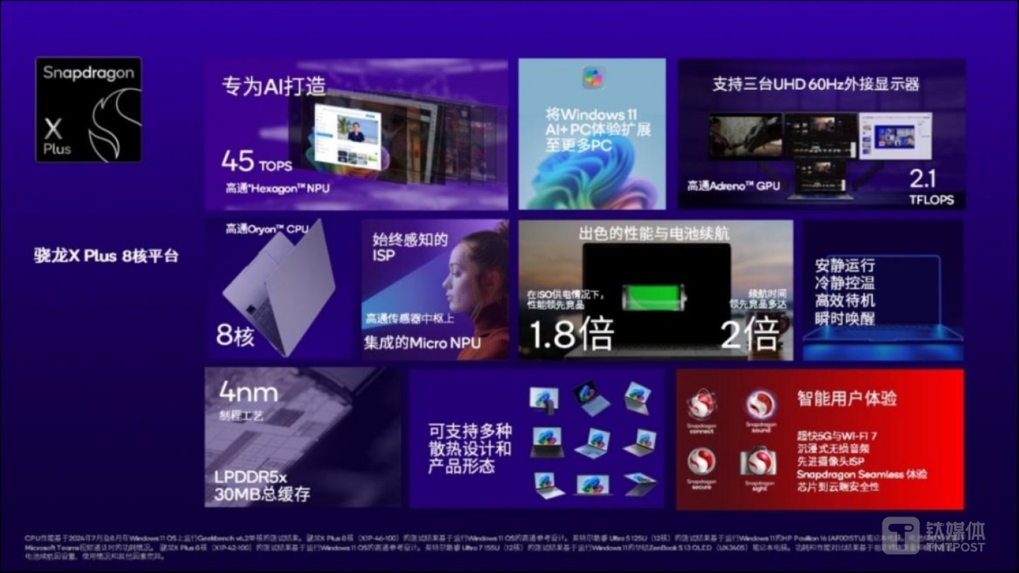 具体来说,骁龙X Plus 8处理器专为运行微软Windows操作系统的PC设计,采用8核高通Oryon CPU,支持超快响应速度和效率,同功耗下实现比竞品高61%的CPU性能,而竞品在同性能表现下所需功耗要多179%,从而承诺能够在保持长时间电池续航的同时处理AI任务。