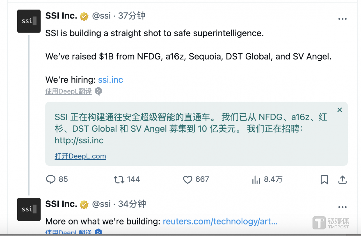 截至发稿前,SSI官方已经证实此事属实,并表示公司正招聘大量 AI 人才。