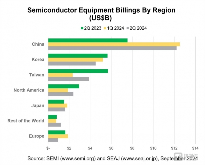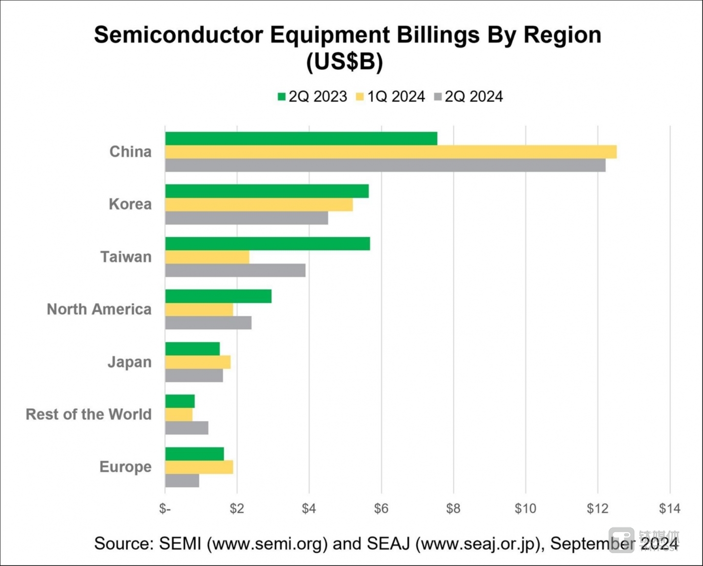 SEMI报告还显示,2024年第二季度,全球半导体设备出货金额同比增长4%,达到268亿美元,同期环比微幅增长1%。其中,中国大陆今年第二季度半导体设备出货金额122.1亿美元,同比大增62%。
