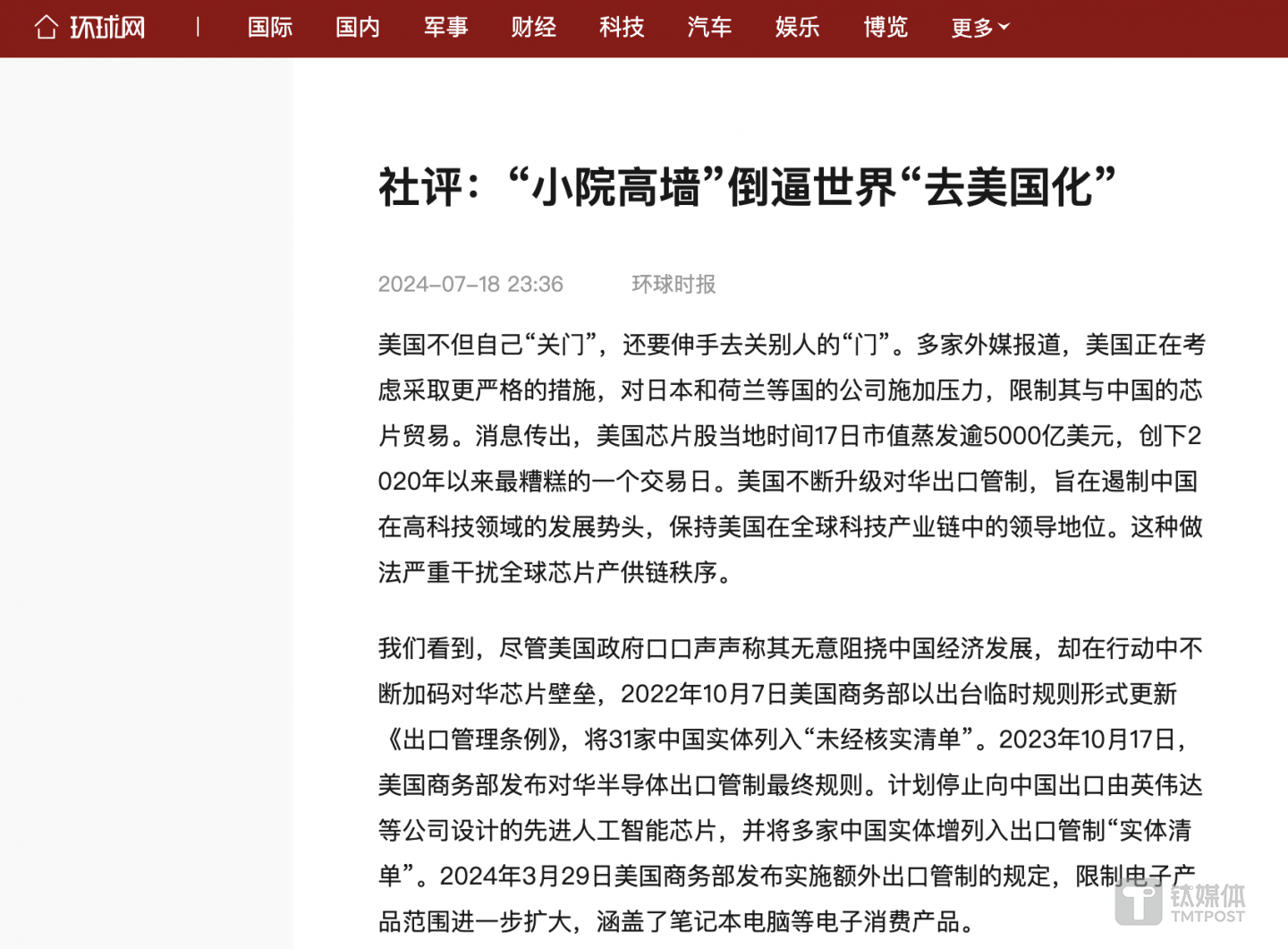 环球时报在此前社评‘“小院高墙’倒逼世界‘去美国化’”文章中指出,美国不断升级对华出口管制,旨在遏制中国在高科技领域的发展势头,保持美国在全球科技产业链中的领导地位。这种做法严重干扰全球芯片产供链秩序。美国通过所谓“芯片外交”,与盟友建立紧密的半导体供应链合作,试图构建一个排除中国的高科技产业领域国际联盟。然而,全球芯片产业链深度绑定,想人为创造一个没有中国的世界,只是一种政治狂想。美国要求盟友国家收紧对中国芯片制造设备的维护服务,这对包括ASML、东京电子等在内的关键设备供应商以及英特尔、高通、英伟达等美国芯片企业产生了直接影响。芯片产业是全球高科技产业链中的关键环节,其稳定性直接关系到电子产品的生产和创新。美国对中国的遏制打压,伤害的是全球,更是会伤害它自己。