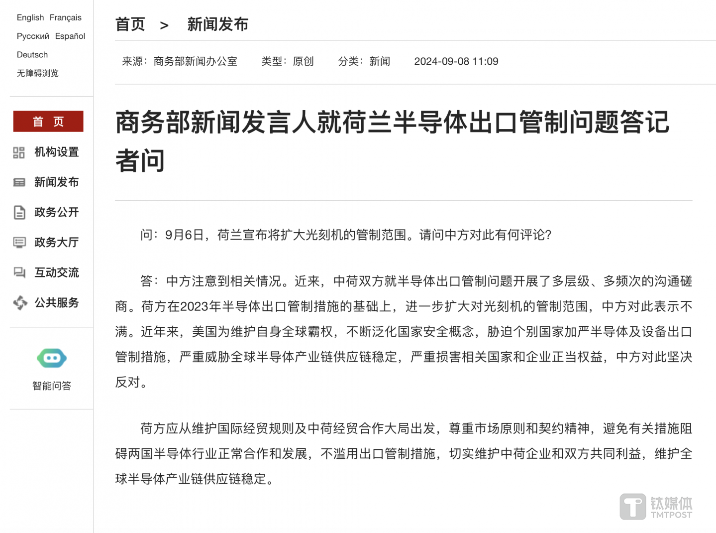 9月8日,中国商务部新闻发言人就此表示,中方注意到相关情况。近来,中荷双方就半导体出口管制问题开展了多层级、多频次的沟通磋商。荷方在2023年半导体出口管制措施的基础上,进一步扩大对光刻机的管制范围,中方对此表示不满。近年来,美国为维护自身全球霸权,不断泛化国家安全概念,胁迫个别国家加严半导体及设备出口管制措施,严重威胁全球半导体产业链供应链稳定,严重损害相关国家和企业正当权益,中方对此坚决反对。荷方应从维护国际经贸规则及中荷经贸合作大局出发,尊重市场原则和契约精神,避免有关措施阻碍两国半导体行业正常合作和发展,不滥用出口管制措施,切实维护中荷企业和双方共同利益,维护全球半导体产业链供应链稳定。